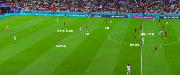 葡萄牙队排出了4-2-3-1阵型,威廉-科瓦略与奥塔维奥搭档双后腰,菲利克斯和B费分别出任左右两边前卫,B席则作为前腰在贡萨洛-拉莫斯身后活动。