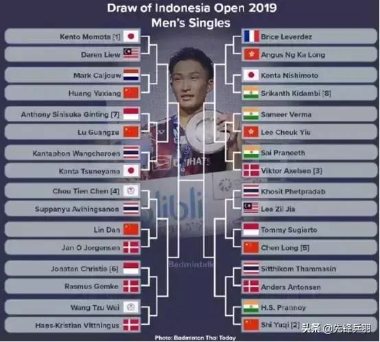 上半区,国羽有:黄宇翔、陆光祖 、林丹,同时本次1号种子桃田贤斗、4号种子周天成、 印尼双子星乔纳坦和金廷分别作为本次6号和7号种子也在上半区,下半区国羽有谌龙(5) 石宇奇(2号种子),另外安赛龙(3号种子)、 斯里坎(8号种子)同在下半区,相对来说,上半区的竞争就激烈很多。