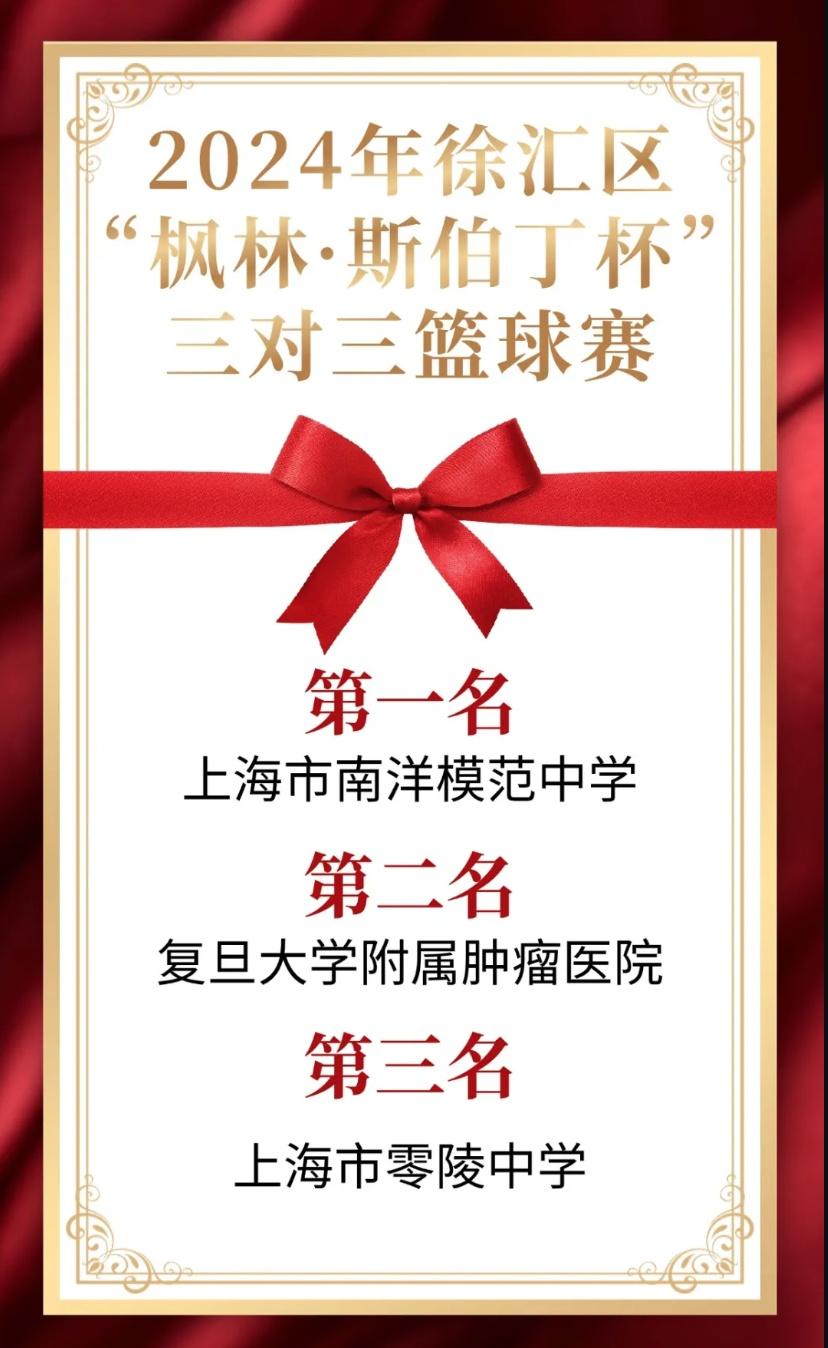 经过紧张激烈的角逐,上海市南洋模范中学、复旦大学附属肿瘤医院、上海市零陵中学分获“枫林·斯伯丁杯”三对三篮球赛的前三名。