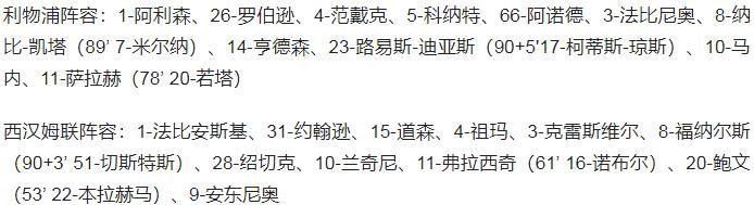 利物浦首发: 1-阿利森;66-阿诺德、32-马蒂普、4-范迪克、26-罗伯逊;3-法比尼奥、14-亨德森、15-张伯伦、;10-马内、11-萨拉赫、20-若塔