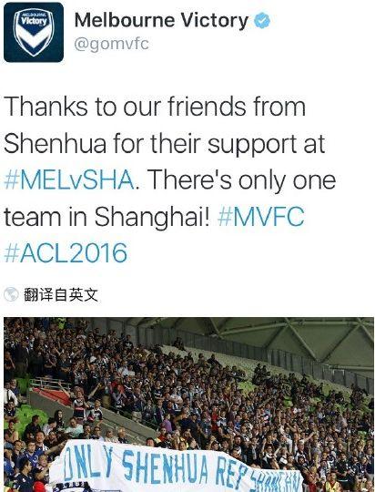 “感谢来自申花球迷朋友在墨尔本胜利VS上海上港的比赛中,对墨尔本胜利的大力支持,上海只有一支球队!”墨尔本胜利官方社交平台写道。他们对申花球迷的“恭维”显得颇为肉麻。