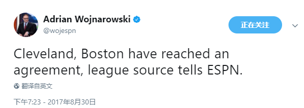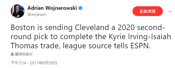 根据ESPN记者Adrian Wojnarowski的报道,骑士和凯尔特人已经正式达成关于欧文的交易。凯尔特人在原来的基础上加上了一个2020年来自热火的二轮选秀权作为补偿给骑士。