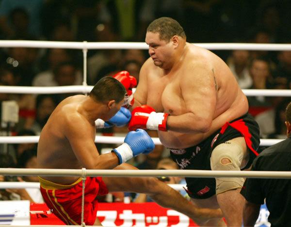 这位相扑手名叫亚伯勒,他是相扑界最重的选手,体重甚至一度达到了415公斤,相比上面的移动沙包曙太郎,亚伯勒的成绩似乎要好一些,他第一次参加MMA比赛就是打UFC,虽然输掉了但是打得并不差,后来他又参加了修斗和PRIDE的比赛,击败了日本拳手中野达夫,最终MMA战绩为1胜2负。
