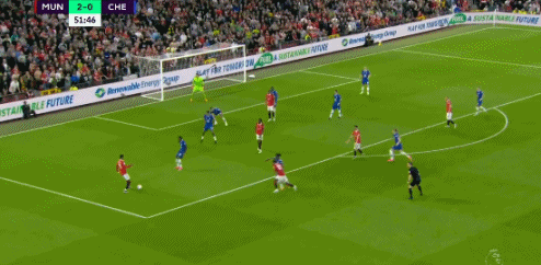 第89分钟,切尔西打出反击,齐耶赫在后场右路送出传球,菲利克斯在中圈接球长驱直入,带球来到禁区前右脚低射,德赫亚扑救不及,切尔西1-4落后曼联。