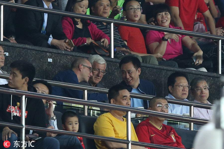 里皮、许家印看台观战。至此,恒大自2011年以来,实现了中超7连冠,继续刷新自己所创造的中国顶级联赛连续夺冠纪录,追平大连的8冠只有一步之遥。(图片署名: 东方IC)