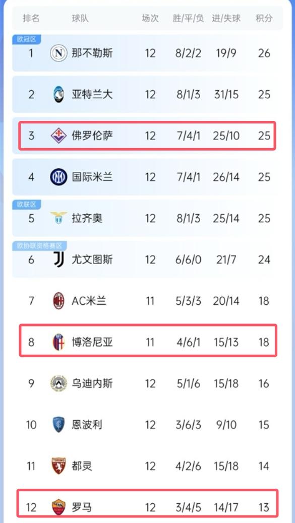另一场比赛博洛尼亚客场3-2击败罗马,球队4胜6平1负在少赛一场(对阵AC米兰延期)的情况下积18分,排名联赛第八,落后前四7分。