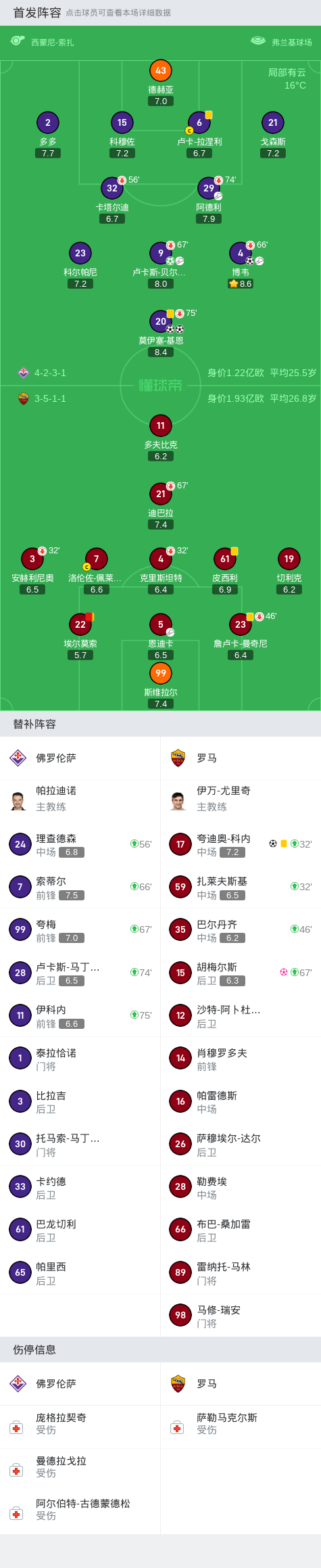 北京时间10月27日3:45,意甲第9轮,罗马客场挑战佛罗伦萨。上半场,莫伊塞-基恩低射破门,博韦禁区内造点,卢卡斯-贝尔特兰主罚命中,卡塔尔迪抽射被扑,夸迪奥-科内远射扳回一分,随后博韦助攻莫伊塞-基恩铲射破门。下半场,博韦攻破旧主球门,迪巴拉任意球攻门被德赫亚扑了一下后击中立柱弹出,随后埃尔莫索犯规累积两黄被罚下,胡梅尔斯刚刚替补登场不慎自摆乌龙,最终,罗马客场1-5佛罗伦萨。