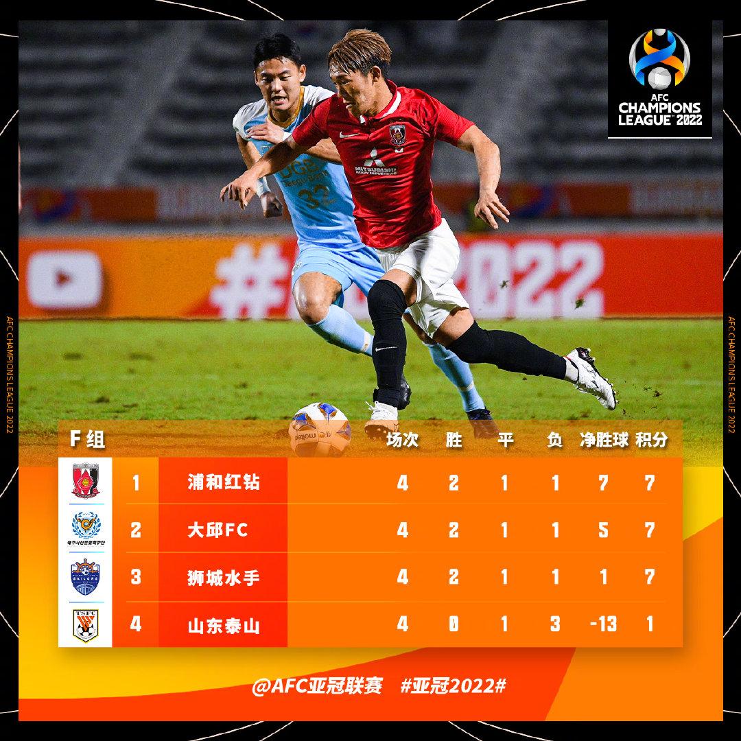 F组:浦和红钻、大邱FC以及狮城水手均2胜1平1负积7分,浦和红钻净胜球优势领跑,大邱FC和狮城水手分居二三位,泰山1平3负位居小组第四位。