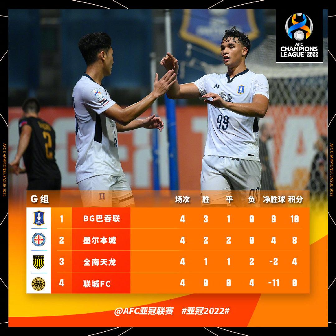 G组:泰国球队BG巴吞联3胜1平不败领跑,墨尔本城8分位居第二位,全南天龙4分第三位,联城FC四连败垫底。