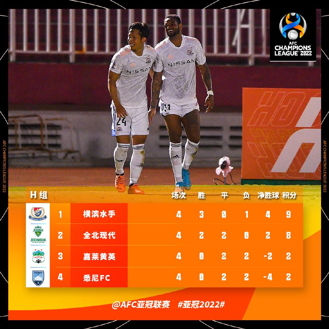 H组:横滨水手3胜1负领跑,全北现代8分第二,嘉莱黄英和悉尼FC2分分居三四位。