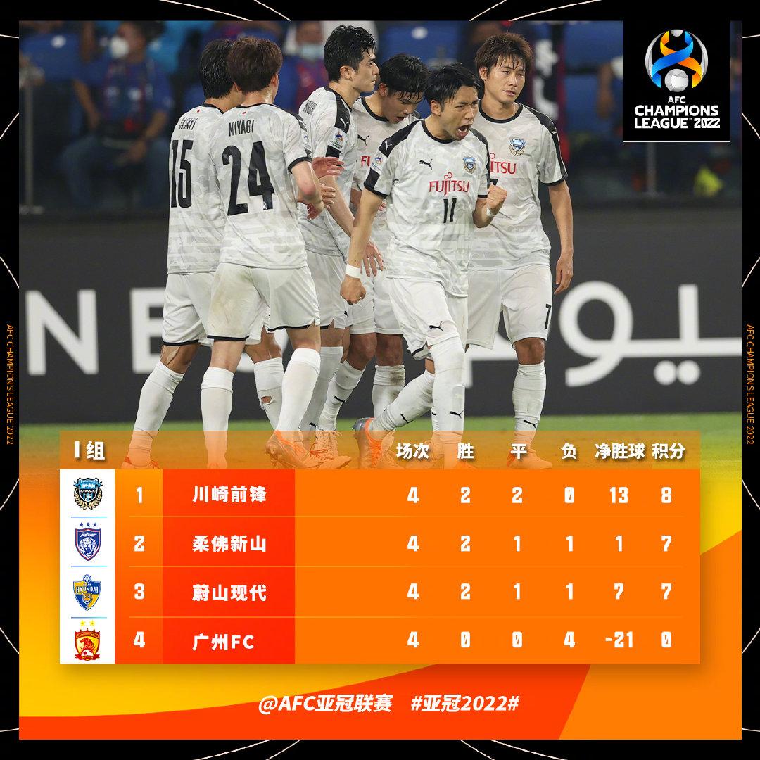 I组:川崎前锋2胜2平8分领跑,柔佛新山和蔚山现代7分位列二三位,广州队四连败垫底。