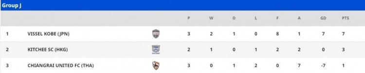 J组:神户胜利船2胜1平7分领跑,杰志1胜1负3分位居第二位,清莱联1分垫底。