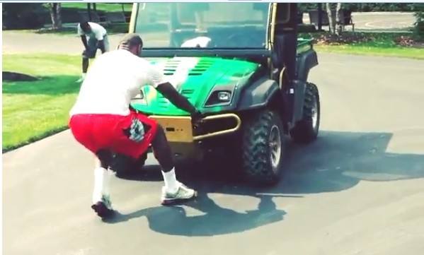 除此之外,健身房里固定的器械已经无法满足老詹的力量训练了,因此詹姆斯每年休赛期都会进行特殊的力量训练,比如之前一个休赛期,他就拿一辆小卡车来当训练工具,只见老詹凭借一己之力将卡车活生生的拖动,由此可见老詹的力量有多恐怖。