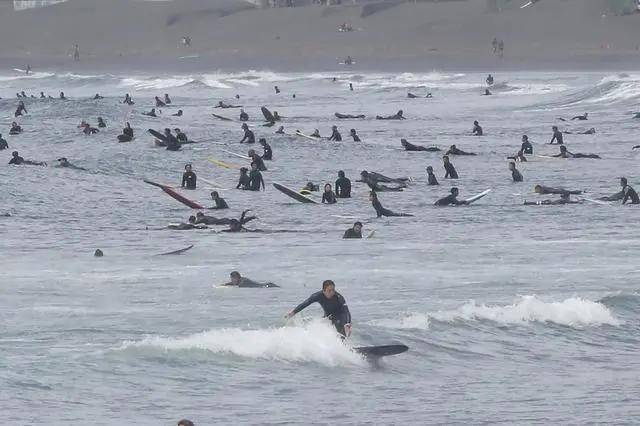 进入春夏季节,前去海边冲浪的人也逐渐变多,尽管在沙滩上没有成堆的游客,但在海面上人们纷纷形成"密集传播群"。连通往海边的路上也因人数太多形成拥堵。