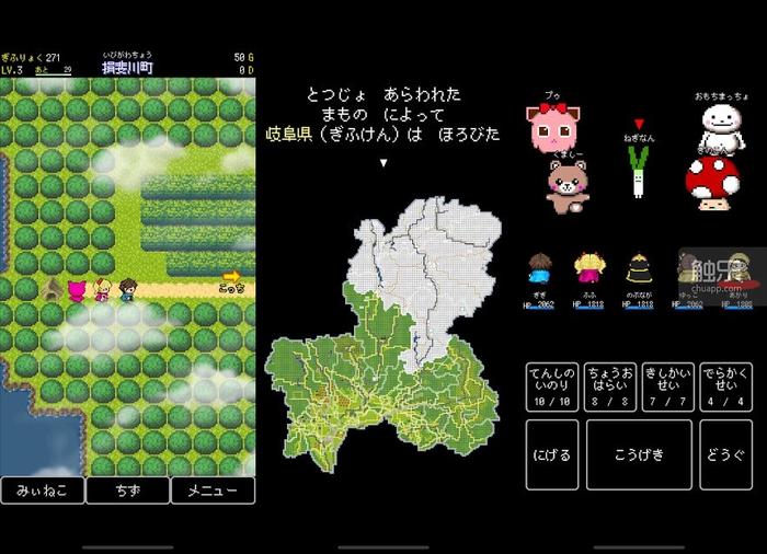 表面上看,这就是一款到处都能见到的像素风魔幻RPG游戏,它的特别之处在于,里面的角色都来自岐阜当地文化——特产、吉祥物、历史名人,各种能够代表岐阜的东西都能在游戏里看到。玩家需要和岐阜古今的名人们联手,走遍岐阜的42个市町村,拯救已经毁灭的岐阜县,成为“最棒的岐阜县民”。