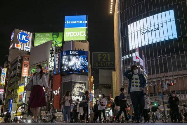 东京都涩谷十字路口的人流,相比此前已减少许多。在新冠疫情影响下,行人多数戴着口罩,一改往常"前胸贴后背"的景象,涩谷的夜晚有些冷清。