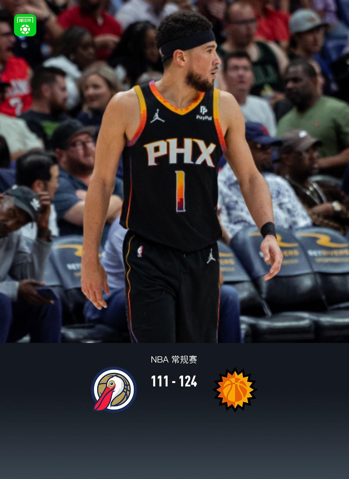 北京时间4月2日NBA 常规赛,新奥尔良鹈鹕对阵菲尼克斯太阳。半场鹈鹕54-74太阳,最终鹈鹕111-124太阳。