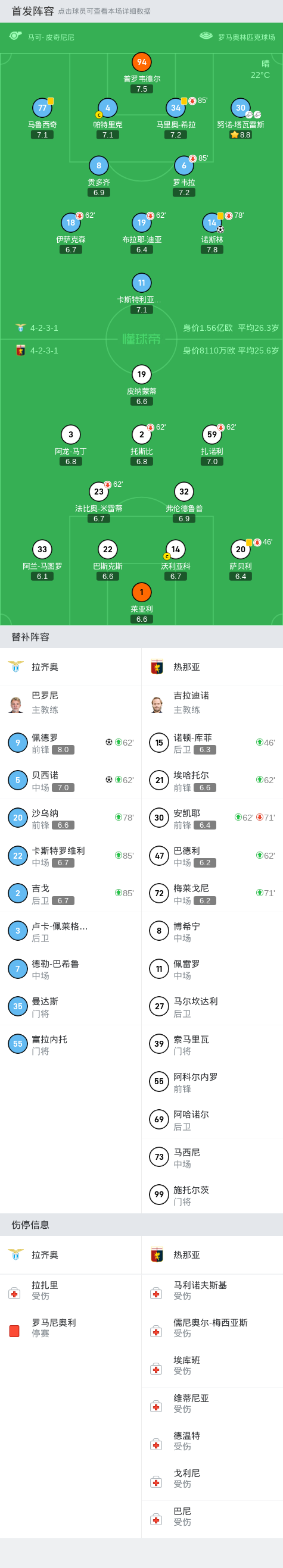 拉齐奥 首发:伊萨克森, 布拉耶-迪亚, 卡斯特利亚诺斯, 诺斯林, 罗韦拉, 贡多齐, 马里奥-希拉, 努诺-塔瓦雷斯, 帕特里克, 马鲁西奇, 普罗韦德尔