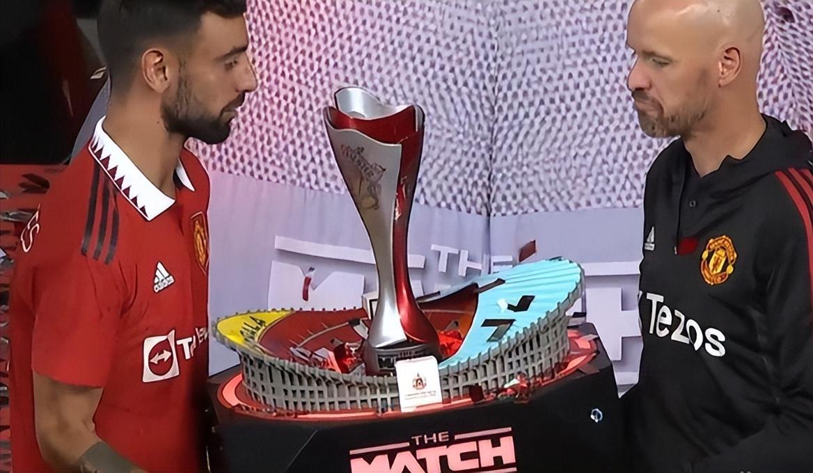 这场比赛也叫“曼谷世纪杯,赛后举行了捧杯仪式,布鲁诺-费尔南德斯和滕哈格捧杯。滕哈格上任后首秀带领曼联拿下第一个冠军,非常完美。