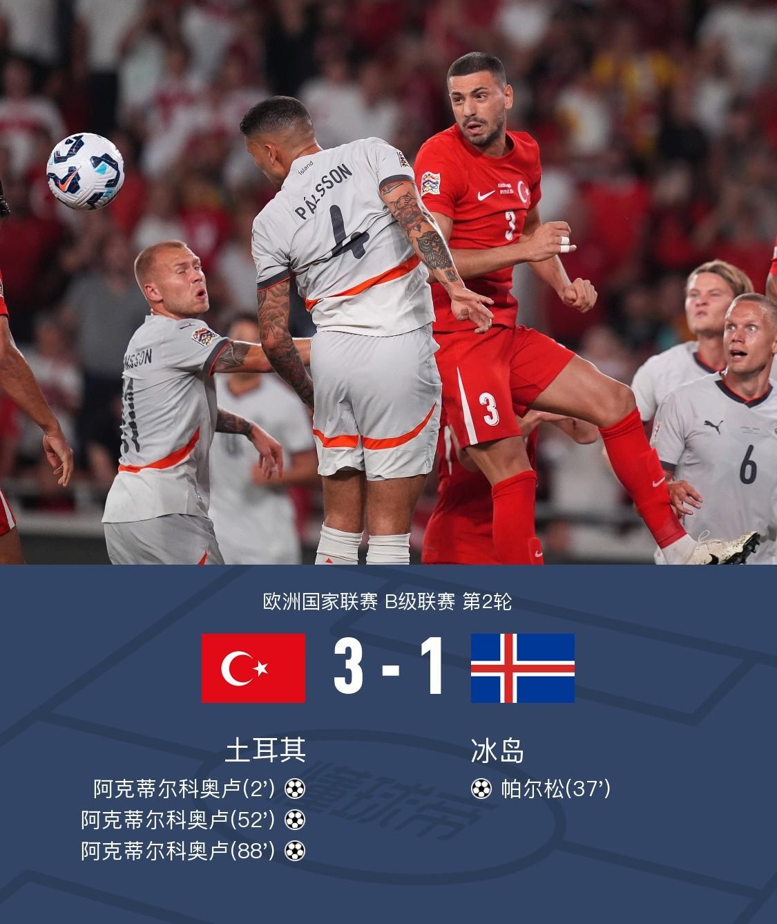 在欧洲国家联赛B级联赛第2轮的比赛中,土耳其队迎战冰岛队。上半场,纳伊尔助攻阿克蒂尔科奥卢推射破门,古德蒙德松角球传中助攻帕尔松头球破门扳平;下半场,阿克蒂尔科奥卢远射飞入网窝上演梅开二度,阿克蒂尔科奥卢再进一球被判越位进球无效,居莱尔精准助攻阿克蒂尔科奥卢挑射得手上演帽子戏法。最终,土耳其队以3-1战胜冰岛队。