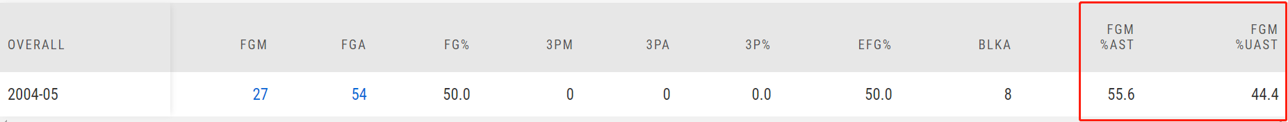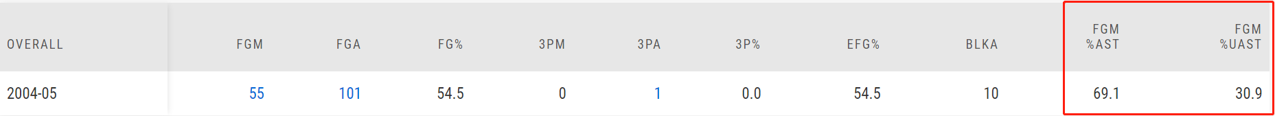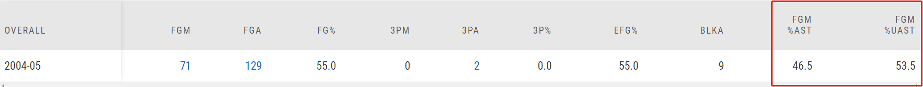 图中的两个数据,%AST( 受助攻率 )和%UAST( 非受助攻率 ) 。可以看出,小斯最习惯的打法是——纳什挡拆顺下,也就是说,小斯是个受助攻率很高的内线。