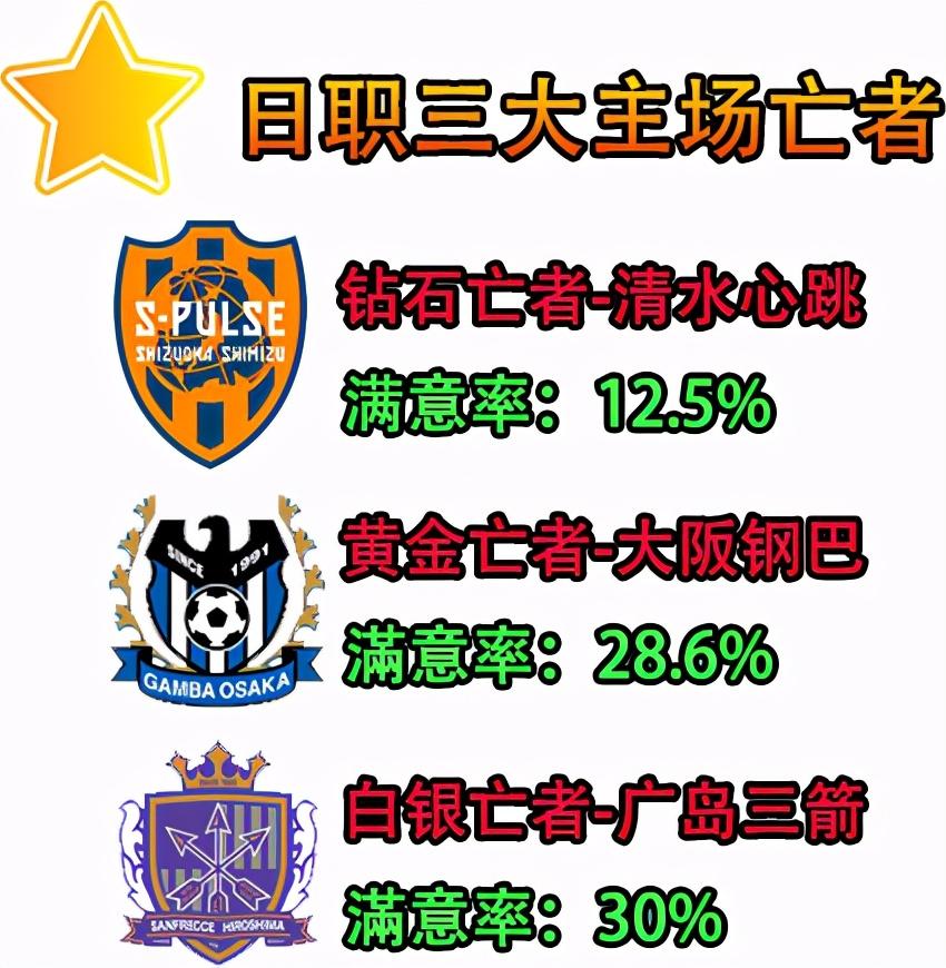 清水8个主场只赢过1场,主场满意率只有12.5%日职倒数第一。