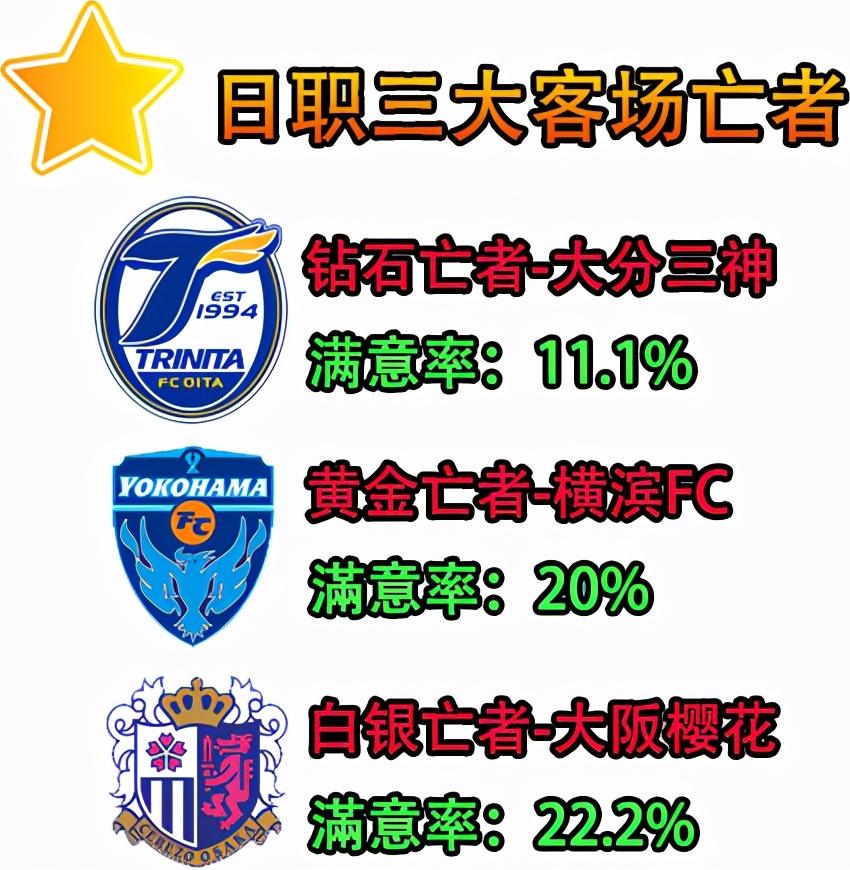 而大分呢?10个主场输了9场,客场满意率只有11.1%,也是倒数第一。