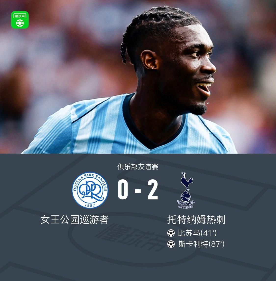 在一场俱乐部友谊赛中,托特纳姆热刺对阵女王公园巡游者。上半场,科利远射制造威胁,热刺新援贝里瓦尔出场26分钟被换下,替补登场的库卢塞夫斯基助攻比苏马破门;下半场洛伊德远射造险,替补登场的斯卡利特抢射破门锁定胜局。最终,热刺2-0战胜女王公园巡游者。