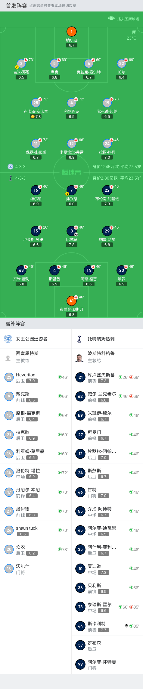 全场比赛结束,热刺2-0女王公园巡游者。