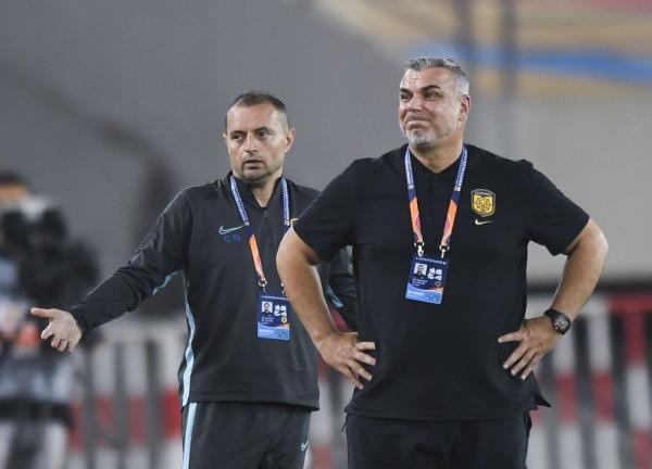 ↑江苏苏宁易购队主教练科斯明·奥拉罗尤(右)在场边观战。