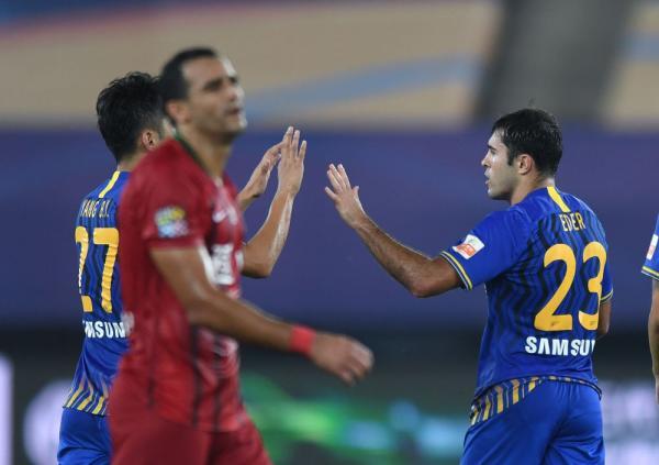 ↑江苏苏宁易购队球员埃德尔(右)进球后与队友杨博宇(左)庆祝。
