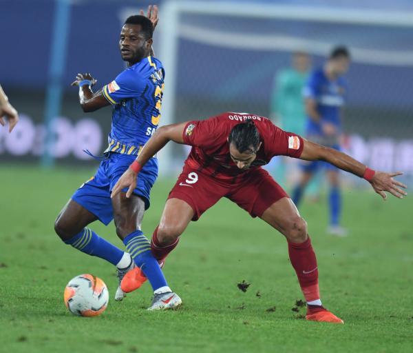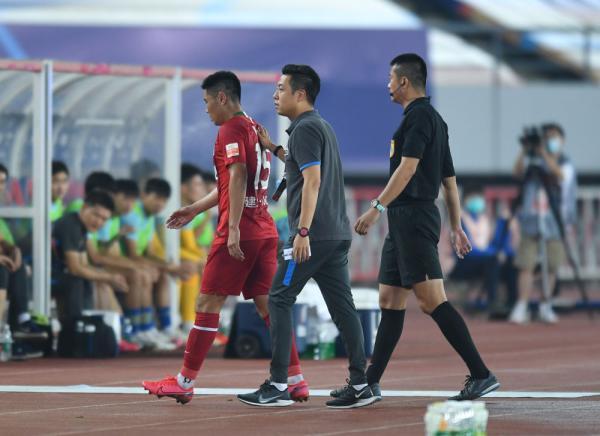 ↑河南建业队球员倪玉崧(左)被红牌罚下后离开场地。