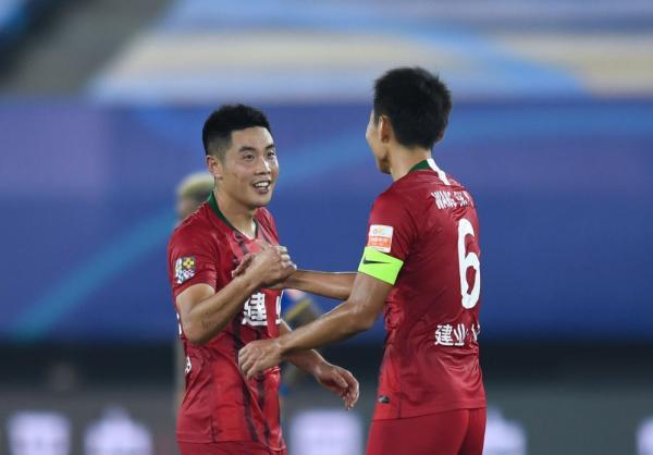 ↑河南建业队球员倪玉崧(左)进球后与队友王上源庆祝。