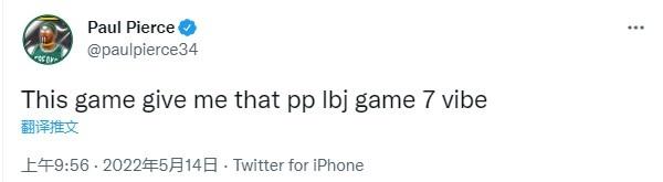 NBA名宿皮尔斯更新个人推特写到:“这场比赛让我想起了往日和詹姆斯打抢七的时光。”