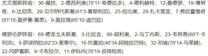 第94分钟,尤文图斯锁定胜局,夸德拉多带球杀入禁区右侧,下底后倒三角传回中路,跟上的达尼洛推射破门,尤文图斯2-0领先佛罗伦萨。