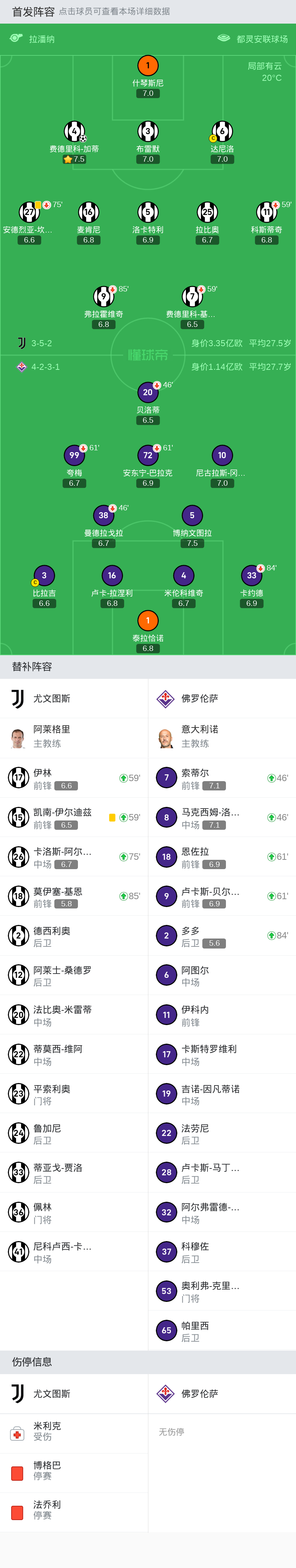 佛罗伦萨 首发:5-博纳文图拉, 1-泰拉恰诺, 3-比拉吉, 20-贝洛蒂, 72-安东宁-巴拉克, 38-曼德拉戈拉, 99-夸梅, 4-米伦科维奇, 10-尼古拉斯-冈萨雷斯, 16-卢卡-拉涅利, 33-卡约德