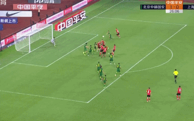第16分钟,傅欢禁区前沿犯规,国安获得任意球机会,比埃拉操刀打近角稍稍偏出。