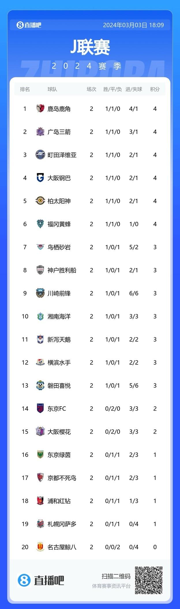 本轮过后J1联赛没有球队获得两连胜,积分榜上鹿岛鹿角凭借净胜球优势暂时排在联赛榜首。