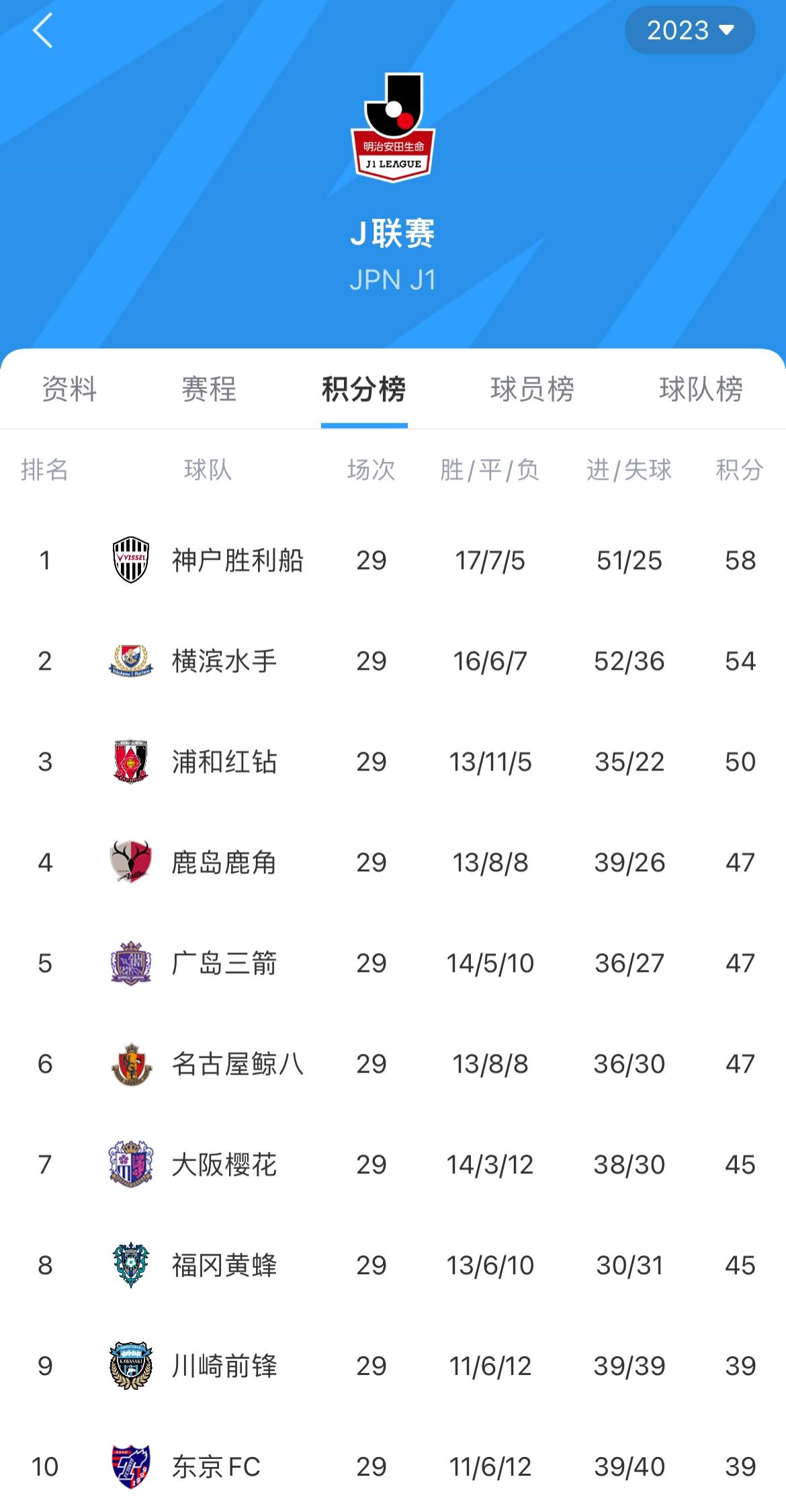 J1联赛最新排名如下↓↓↓