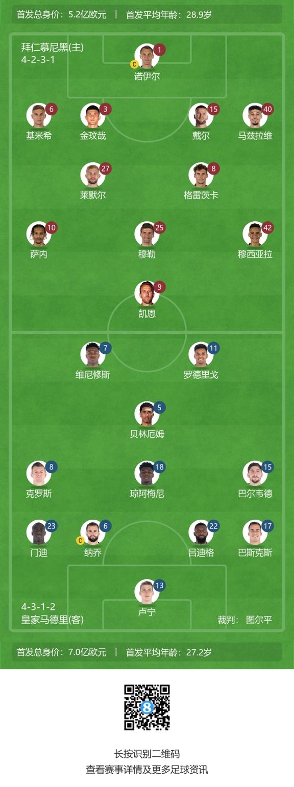 拜仁首发:1-诺伊尔、6-基米希、15-戴尔、3-金玟哉、40-马兹拉维、27-莱默尔、8-格雷茨卡、10-萨内、42-穆西亚拉、25-托马斯-穆勒、9-凯恩