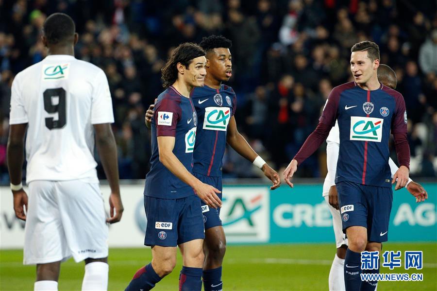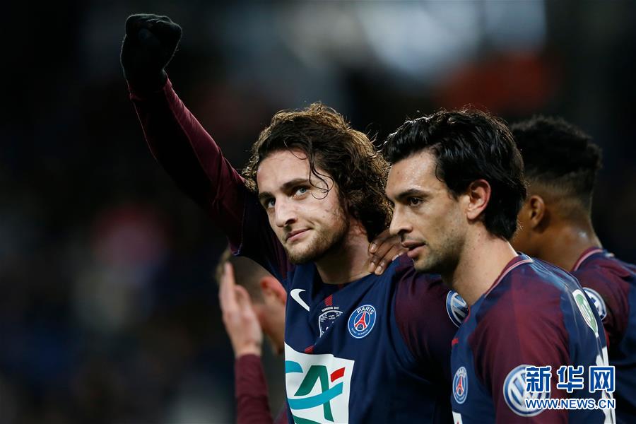 ↑1月24日,巴黎圣日耳曼队球员拉比奥(左)在比赛中庆祝进球。当日,在2017-2018赛季法国杯1/16决赛中,巴黎圣日耳曼队主场以4比2战胜甘冈队。 新华社/法新