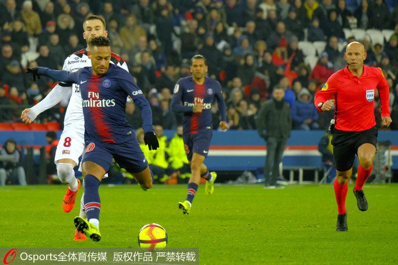 第11分钟巴黎率先破门,阿尔维斯禁区外右路挑传禁区,内马尔胸部停球后又挑球过掉伊科科,面对门将轻巧推射破门,巴黎1-0领先甘冈!