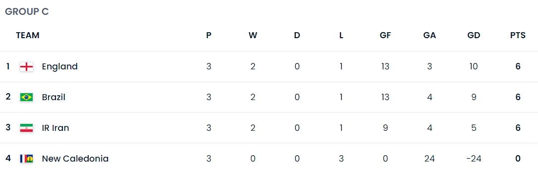 积分榜上,C组和此前结束比赛的D组一样,出现三支球队2胜1负的情况。英格兰(净胜球+10)、巴西(净胜球+9)、伊朗(净胜球+5),同积6分的三队携手出线。新喀里多尼亚一场未胜一球未进,净胜球-24小组垫底。