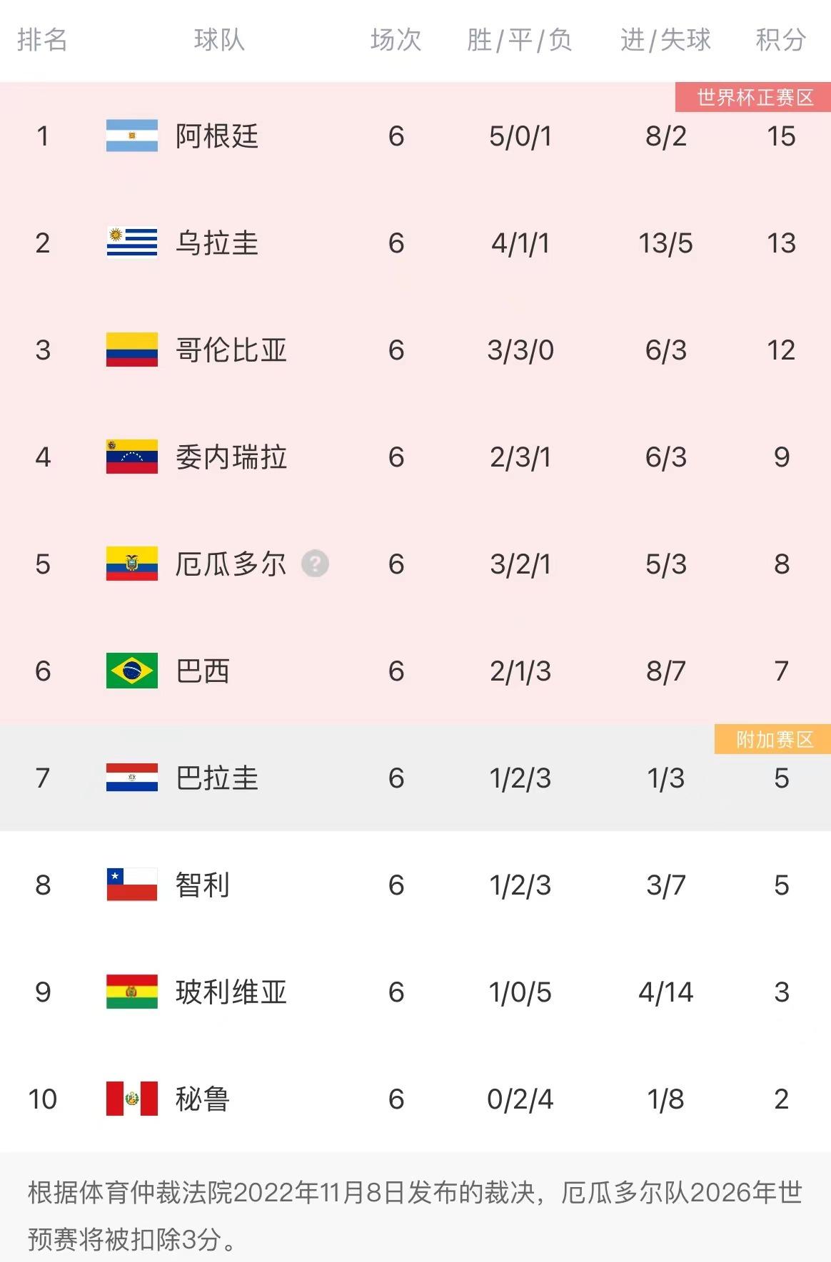 目前南美世预赛6轮过后,阿根廷5胜1负高居第一,智利仅积5分排在第八。