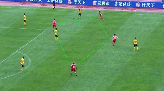 图4:在本场比赛中,延边富德的高位逼抢做的十分坚决。上图就是球队在前场进行了高强度的逼抢,前场四人组逼抢的力度很大,最终迫使恒大大脚解围。
