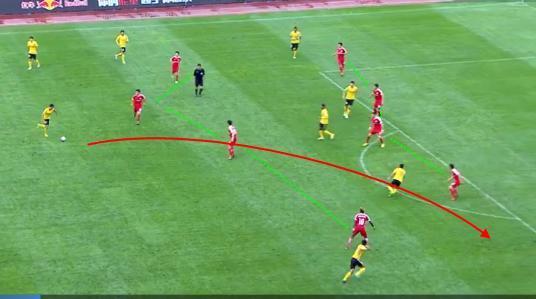 图7:反击迅速果敢。在后场断球之后,延边队快速的打击十分果断,上图就是球队经过简单的几次传递就直接把球打到恒大防线身后。