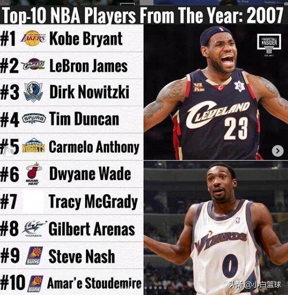近日,美国媒体NSIDER重排了2007年联盟前十巨星,因为时隔多年,我们先来回顾一下那个赛季的大概情况。那一年德克-诺维斯基拿下了常规赛MVP,他带领小牛拿下了67胜15负的联盟第一战绩,可惜的是小牛在季后赛首轮被巴朗-戴维斯带领的金州勇士黑八,这一年的总决赛对阵双方是骑士与马刺,骑士0-4被马刺横扫,这次小皇帝生涯首次进入总决赛,年仅22岁的勒布朗-詹姆斯让联盟亮眼,他带领骑士拿下50胜东部第二的战绩,在MVP榜单上排在第二,那个赛季在季后赛之前,联盟第一人给的是诺维斯基,总决赛后联盟第一人给的是邓肯,可美媒这次的排名有所不同。