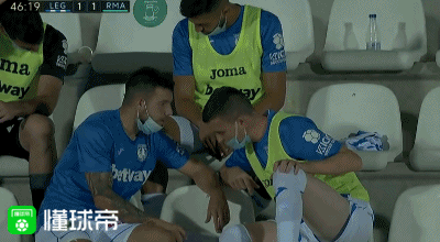 下半场开始前,莱加内斯球员在替补席观看手机,时刻关注球队保级形势。