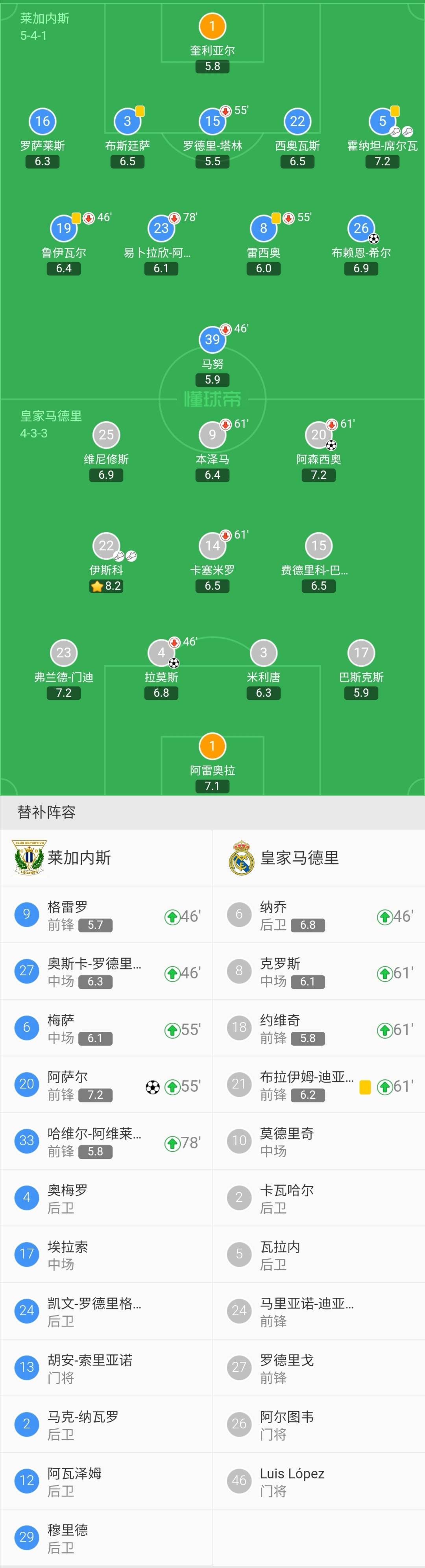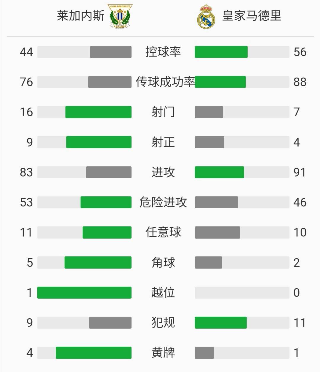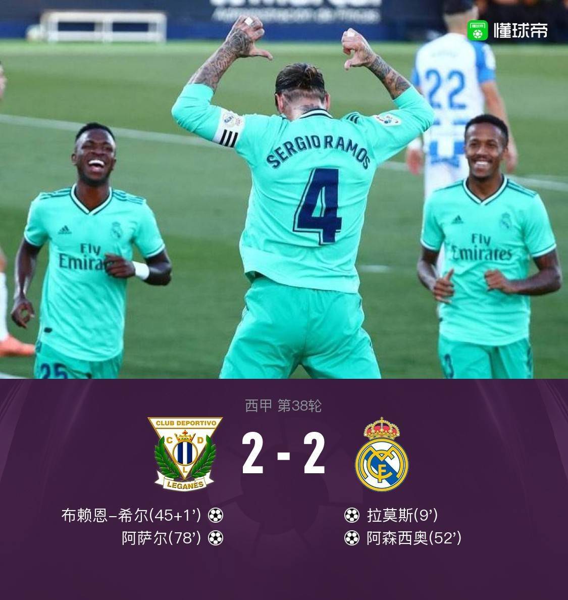 全场比赛结束,皇马客场2-2战平莱加内斯。