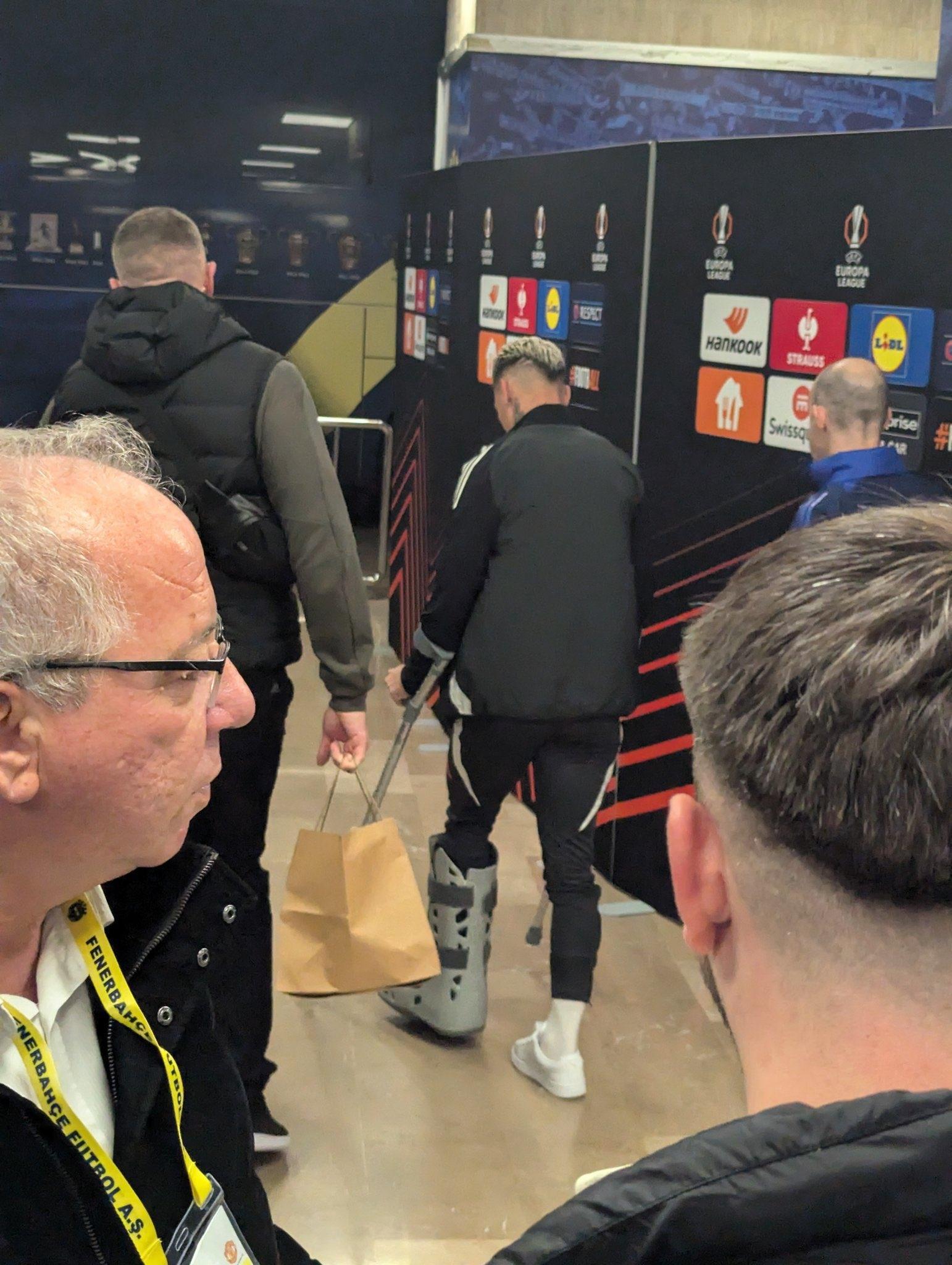 曼联vs费内巴切比赛后,安东尼拄着拐杖带着护具离开体育场。